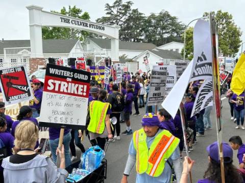 Several hundred janitors marched to join writers on the picket line outside Sony Pictures and Amazon Studios Thursday, as some custodial staff have lost their jobs while productions are halted.