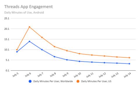 Threads' best day was July 7, just two days after launch, but the number of daily active users steadily declined from there. Total daily minutes of use — a different metric that looks at how much time users are spending with the app — has also fallen from 21 minutes on July 7 to just over 6 minutes on July 14, Similarweb claims.