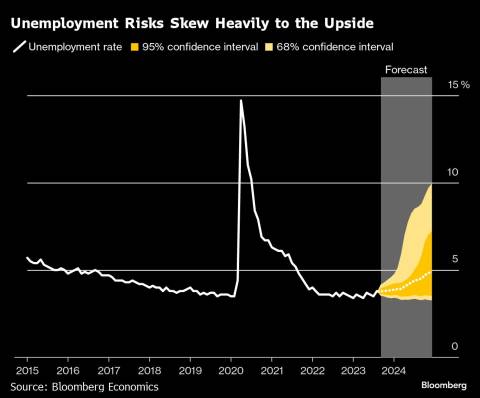 But what if there’s a break in the trend — the type of sudden shift that occurs when the economy goes into a dive? Using a model designed to allow for these nonlinearities, Bloomberg Economics has forecast not just the most likely path for the unemployment rate, but the distribution of risks around that path.