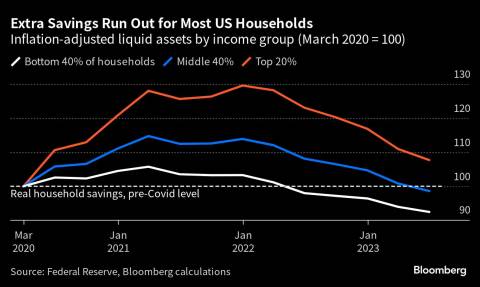 What’s more, the extra savings that Americans amassed in the pandemic — thanks to stimulus checks and lockdowns — are running out. There’s a debate over how fast, but the San Francisco Fed calculated that they’d all gone by the end of September. Bloomberg calculations show that the poorest 80% of the population now have less cash on hand than they did before Covid.