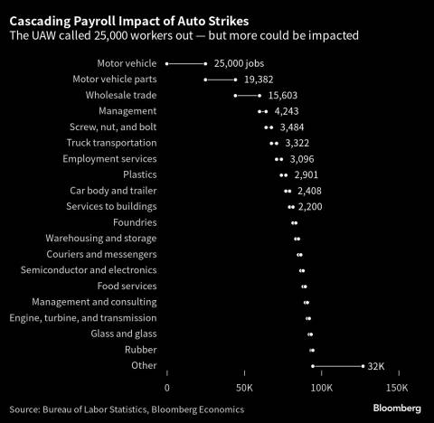 - Auto Strike: The United Auto Workers union has called a walkout at America’s Big Three auto firms, the first time they’ve all been targeted at the same time. It expanded the strike on Friday to encompass some 25,000 workers. The industry’s long supply chains means stoppages can have an outsize impact. In 1998, a 54-day strike of 9,200 workers at GM triggered a 150,000 drop in employment.