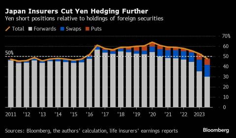 (Bloomberg) -- Japanese life insurers have cut currency hedging by the most in more than a decade, signaling receding concern of a rebound in the yen that would wipe out returns from overseas assets.
