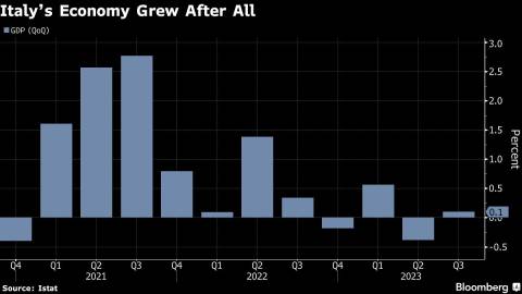 (Bloomberg) -- Italy’s economy eked out some growth in the third quarter after all instead of the stagnation originally estimated by the country’s national statistics institute.
