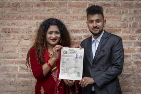 KATHMANDU, Nepal (AP) — The first gay couple in Nepal to have their same-sex marriage officially recognized vowed Friday to campaign for changes in the law to help others like them to get married.