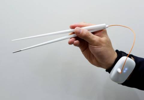 Co-developed by Meiji University professor Homei Miyashita and beverage maker Kirin Holdings Co., the chopsticks enhance tastes using electrical stimulation and a mini-computer worn on a wristband.
