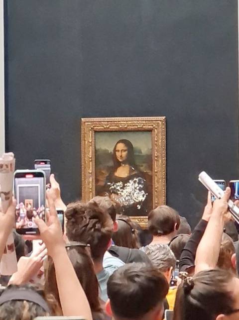 PARIS (Reuters) - The Mona Lisa was left shaken but unharmed on Sunday when a visitor to the Louvre tried to smash the glass protecting the world's most famous painting before smearing cream across its surface in an apparent climate-related publicity stunt.