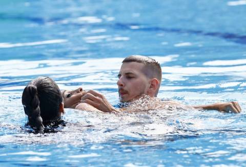 It was the second time Fuentes has had to rescue Alvarez after she leapt into the pool during an Olympic qualification event last year and pulled her to safety along with the American's swim partner Lindi Schroeder.