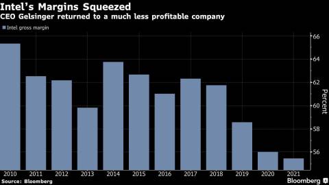 Intel said gross margin, or the percentage of sales left after deducting production costs, will be 47% in the current period. That metric of profitability, once touted as an indication of Intel’s strength, was squeezed by increasing competition and is now more than 10 points narrower than the company’s annual gross margins for much of the past decade.