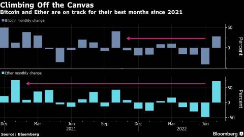 (Bloomberg) -- Bitcoin and Ether, the world’s two largest digital tokens, are headed toward their best months since 2021 amid a revival of risk appetite in global markets and optimism about an Ethereum network upgrade.