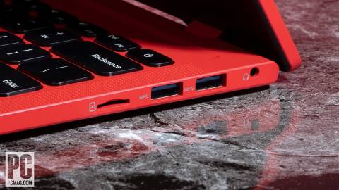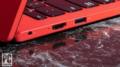 Along the right side of the laptop, there’s a dedicated headphone jack, two USB Type-A ports, and a microSD card reader. The left side has a third USB Type-A port, an HDMI port for using a second screen, and a barrel-style port for charging. There are no USB-C ports, a surprising omission for a modern laptop.