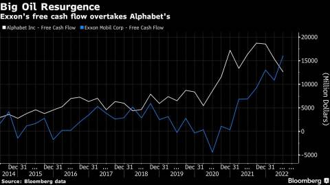 (Bloomberg) -- Exxon Mobil Corp.’s cash haul overtook that of Alphabet Inc. for the first time since 2018, proving the oil giant is back in the big league just a year after suffering one of the biggest activist shareholder upsets in corporate history.