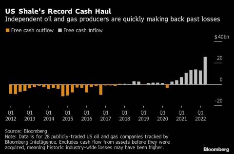 The top 28 publicly traded US independent oil producers generated $25.5 billion in free cash flow in the three months to June 30, according to estimates compiled by Bloomberg. In that space of time they’ll have made enough cash to erase one-fourth of what they lost over the previous decade.