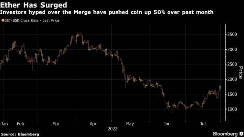 Ether has surged in recent weeks as optimism grows over its long-anticipated software upgrade, which will facilitate a move from the current system of using miners to a more energy-efficient one using staked coins. The switch to this so-called proof-of-stake system is expected to take place in September after being kicked down the road for several years. Ethereum developers have recently signaled continued progress in testing the new system, and they are holding a series of events for prospective stakers and other community members in the coming weeks.