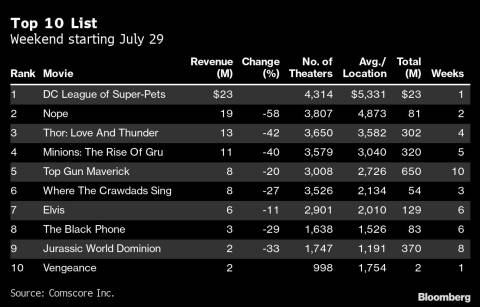 (Bloomberg) -- “DC League of Super-Pets,” an animated family film from Warner Bros., topped a weaker North American box office this weekend, as the major summer moviegoing season starts to draw to a close.