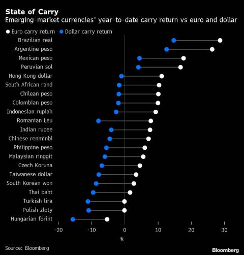 Euro-funded carry trades are offering a refuge to emerging-market traders, who are nursing losses across asset classes and strategies amid a surge in the dollar and US yields. A bear market in developing-nation equities is deepening, an index of local-currency bonds is at a two-year low and dollar notes are posting the biggest declines since 1994. If the prospects of a US recession and Federal Reserve tightening continue to fuel a rush into the dollar, the euro carry may well become irresistible to more investors.