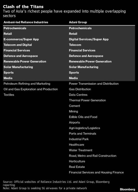 The two billionaires also have significant overlap in green energy, with each pledging to invest more than $70 billion in a space that’s heavily tied to the priorities of Indian Prime Minister Narendra Modi’s government. Meanwhile, Adani has begun signaling deep ambitions in digital services, sports, retail, petrochemicals and media. Ambani’s Reliance either already dominates these sectors or has big plans for for them.