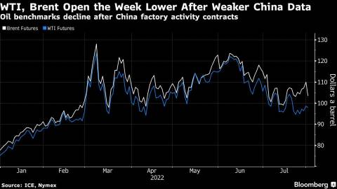 West Texas Intermediate dropped toward $98 a barrel after sinking almost 7% in July in the first back-to-back monthly loss since late 2020. Weekend data indicated a surprise contraction in Chinese factory activity, highlighting the cost of Beijing’s preference for mobility curbs to tackle Covid-19.