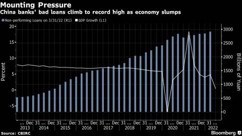 Bad loans at lenders, which amounted to 2.9 trillion yuan at the end of March, are poised to reach new records and further strain an economy that’s expanding at the slowest pace since the onset of the Covid outbreak.