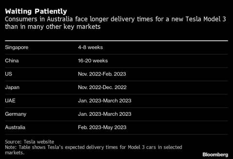 A top-of-the range Model 3 Performance costing A$91,600 ($64,200) ordered in Sydney today would be delivered between February and May 2023, according to Tesla’s website. That’s a longer lag than in the US, Japan and Germany, while Tesla fans in Singapore might have to wait only four weeks.