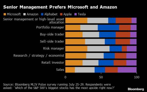 Still, survey respondents are less confident in Tesla’s upside relative to four other megacaps in the S&P 500. About a quarter said Microsoft Corp. offered the most potential, roughly the same share as Amazon.com Inc. Alphabet Inc. got 21% of the vote while Apple Inc. received 18%. Tesla came in last, with 12.5%.