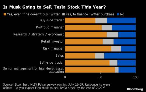 About 75% of 1,562 respondents, who include portfolio managers and retail traders, say Musk won’t end up owning Twitter Inc. -- a deal that led him to offload about $8.5 billion of Tesla shares in April. A third of respondents predict he will settle with the social-media company for more than $1 billion rather than seeing through his $44 billion takeover at $54.20 per share, while 27% think a judge will order him to pay the $1 billion breakup fee.