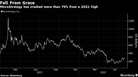 The tech company whose stock serves as a vehicle to invest in Bitcoin has erased more than three-quarters of its value from a February 2021 peak. The stock, which has rallied 73% from the end of June amid a broader risk-on trade, hasn’t closed above its 200-day moving average since December.