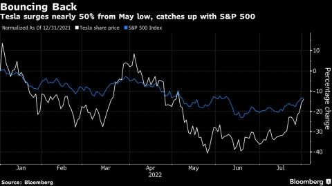 (Bloomberg) -- Shares of Tesla Inc. are nearing a 50% gain from lows touched in May, ahead of a shareholder vote later this week on the electric-vehicle maker’s stock-split plan.