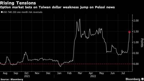 “There is obviously near-term risk to the yuan and the Taiwan dollar from the Pelosi visit,” said Alvin Tan, head of Asia currency strategy at RBC Capital Markets in Hong Kong. “Some economic response against Taiwan is inevitable, otherwise the loss of face for China after all the threats would be unbearable.”
