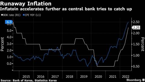 (Bloomberg) -- South Korea’s inflation accelerated further in July, underscoring the central bank’s need to keep raising interest rates to try to rein in mounting price pressures.