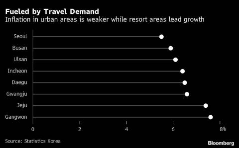 - Gangwon province, a popular travel area along with Jeju island, led the growth among regions, seeing prices rise 7.6%. Inflation in Jeju came at 7.4%. Seoul saw the smallest increase at 5.5%.