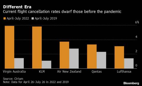 Zeroing in on a group of 19 airlines around the world -- the same one Qantas Airways Ltd. uses to assess its performance against peers -- Virgin Australia canceled the biggest proportion of flights in the three months through July 26, according to data from analytics company Cirium. It axed close to 2,200 flights, or 5.9% of its schedule, compared with 1.4% in the same period in 2019.