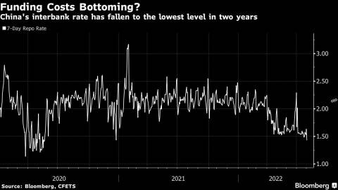 That’s prompted some cash-rich lenders and to buy government, policy bank bonds and high-grade corporate debt. The seven-day repo rate fell to 1.43% on Monday, the lowest in more than two years, indicating the level of excess liquidity.