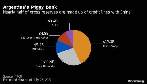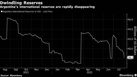 A worsening trade balance in Argentina, a net energy importer, is also to blame for its lack of reserves. The rising global cost of energy and rampant government spending in the first half of the year caused total import costs to outpace revenue from agriculture and other exports. Argentina’s trade balance dipped negative in June for the first time since December 2020, according to Bloomberg data.