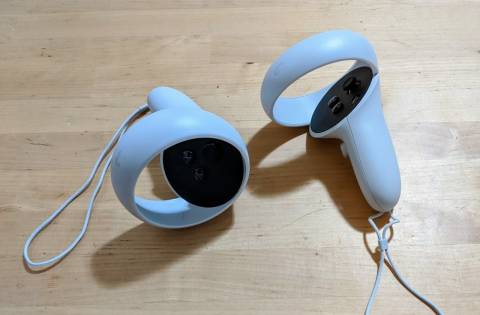 The two motion controllers included with the Quest 2 have seen a slight redesign from the original Oculus Touch controllers used with the Quest and the Rift S. They’re still rounded handles with prominent rings on top for the headset’s cameras to track their position, and the two triggers still fit naturally under your index and middle fingers. The circular control surface at the top of the handle, right under your thumb, is larger than before, with a comfortable, bare spot to rest your thumb when you aren’t actively using the analog stick or two face buttons.