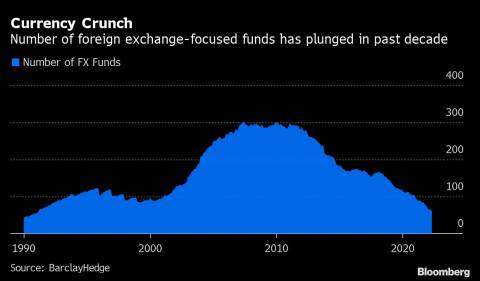 All this is a world away from the hostile market regime after the global financial crisis, when central bankers launched dovish policies in unison -- upending carry and momentum strategies while snuffing out price swings and macro trends. That sparked a crisis for such traders which endures today even with the recent windfall. The number of FX-focused private funds was at its peak in January 2010, according to data provider BarclayHedge, but the count has since fallen by nearly 80%.