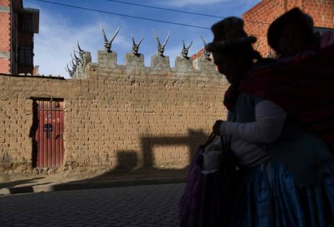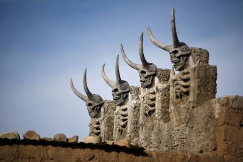 The adobe-brick house in the high-altitude city of El Alto belongs to David Choque, who hired an artist to create the skeletal devils from cement and wood and installed them on his roof, doors and walls.