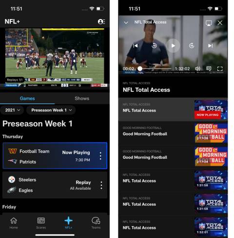 The service includes live content, too. For example, you can listen to full audio streams of each game as it airs. NFL+ also lets you watch live, out-of-market preseason games. You can even watch live, local prime-time games, but only on your smartphone or tablet.