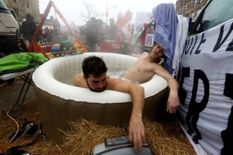 In a nod to how entrenched the protesters are, several have set up mailboxes outside their trucks. Organizers set up bouncy castles for children at the site while a portable hot tub has proved popular, with protesters lounging in bubbling water.