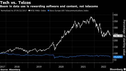 Broadband operators argued that the rewards from suddenly carrying 40% more downstream traffic and double the upstream traffic during the pandemic went to US tech platforms, while they were stuck footing the bill. The Stoxx 600 Europe Telecommunications Index has lost a quarter of its value in the last five years, while the NYSE FANG+ Index tracking the biggest tech stocks has more than doubled.