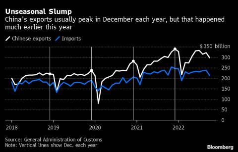 (Bloomberg) -- China’s exports growth fell for the first time in more than two years in October, as demand weakens on rising risks of a global recession.