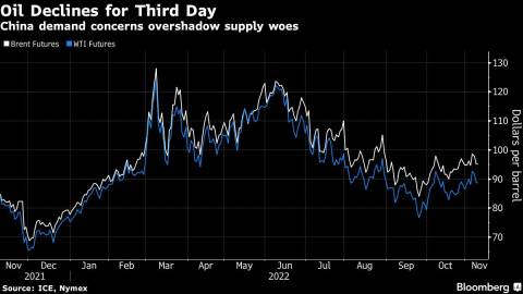 West Texas Intermediate sank toward $88 a barrel after sliding 4% over the first two days of the week. Swelling virus outbreaks in China show the strain the Covid Zero strategy is facing, with even harsh lockdowns and mass testing failing to bring them under control. In the capital, Beijing, cases hit the highest in more than five months, with 78 new infections reported for Wednesday.