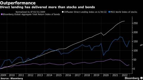 A gauge of US direct lending, which accounts for roughly half of private credit assets, rose 2.3% in the first half of this year as stocks and bonds suffered double-digit declines.