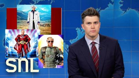Semi-retired maniac Donald Trump has launched a collection of digital NFT trading cards depicting him in various costumes, including cowboy, super-hero, and most unbelievable of all, guy who didn't dodge the draft, said Colin Jost as a picture of Trump in a flight-suit flashed across the screen.