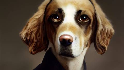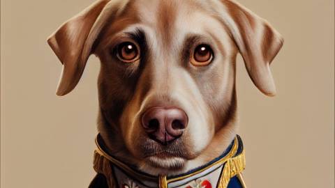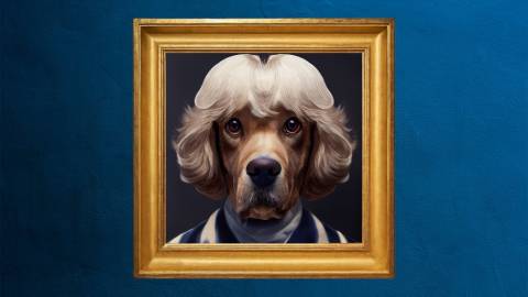 The artwork that bears the most unmistakable resemblance to its human inspiration is probably that of Camilla, Queen Consort, recreated as a basset hound whose face is framed by a very familiar blonde hairdo. The other portraits are actually quite subtle, looking much more like dogs than people—except for their apparel, and something uncannily human in their expressions.