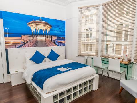 At the top end of Regency Square and facing the i360 observation tower and skeletal West Pier, Artist Residence is an impressively stylish, 25-room boutique hotel. Junk shop finds – old tea chests, copper slipper baths, wrought iron beds and vintage lamps – mix with striking graffiti or murals hand painted by the owners’ favourite contemporary artists.