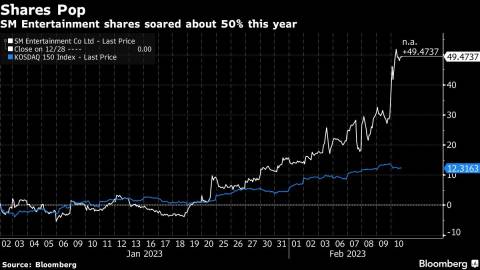 SM’s shares soared as much as 19% in Seoul trading, hitting an all-time high. Hybe rose more than 10%, while Kakao fell as much as 6.5%.