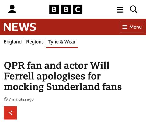 βIn a BBC News Online article, we incorrectly stated QPR fan and actor Will Ferrell apologised for mocking Sunderland fans, the BBC said in a statement. A quote was taken from a verified Twitter account, but it was not made by the actor. We have removed the article in its entirety since it was based wholly on the apology.β