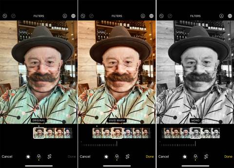 Next to the Adjustment icon on the bottom toolbar is the Filter icon. Tap that icon and check out the different filters, including Original, Vivid, Vivid Warm, Vivid Cool, Dramatic, Dramatic Warm, Dramatic Cool, Mono, Silvertone, and Noir. Adjust the slider bar for each filter in order to increase or decrease its intensity.