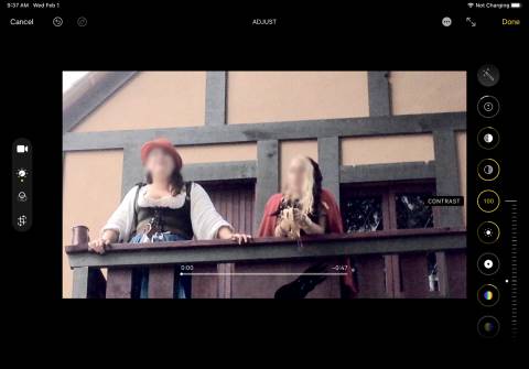 Once the trimming is out of the way, the editing process for video works the same as it does with photos. Select the Adjustment icon on the toolbar to adjust the attributes of the clip. Tap the Auto icon to change all the attributes in one shot, or choose each individual icon to tweak the attribute separately. Just like with a photo, you can tap Undo in the top-left corner to take back your last action; tap Redo to repeat your last action.