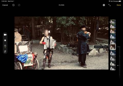 Tap the Filter icon to apply different types of color filters to the video. These filters include Original, Vivid, Vivid Warm, Vivid Cool, Dramatic, Dramatic Warm, Dramatic Cool, Mono, Silvertone, and Noir. Adjust the slider bar for each filter to increase or decrease its intensity.